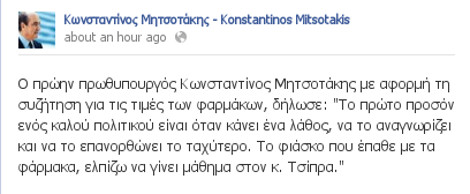 «Το πρώτο προσόν ενός καλού πολιτικού είναι όταν κάνει ένα λάθος, να το αναγνωρίζει και να το επανορθώνει το ταχύτερο. Το φιάσκο που έπαθε με τα φάρμακα, ελπίζω να γίνει μάθημα στον κ. Τσίπρα».